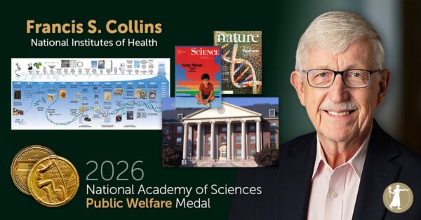 The 2026 Public Welfare Medal will be presented to Francis S. Collins, former director, National Institutes of Health (NIH), for his pioneering research in human genetics and critical contributions to public welfare as the leader of the Human Genome Project. Collins’ scientific and public service career has advanced understanding of human disease, strengthened ethical frameworks in genetics, fostered public trust in science, and guided national and global responses to health crises. The medal is the Academy’s most prestigious award, established in 1914 and presented annually to honor extraordinary use of science for the public good.
